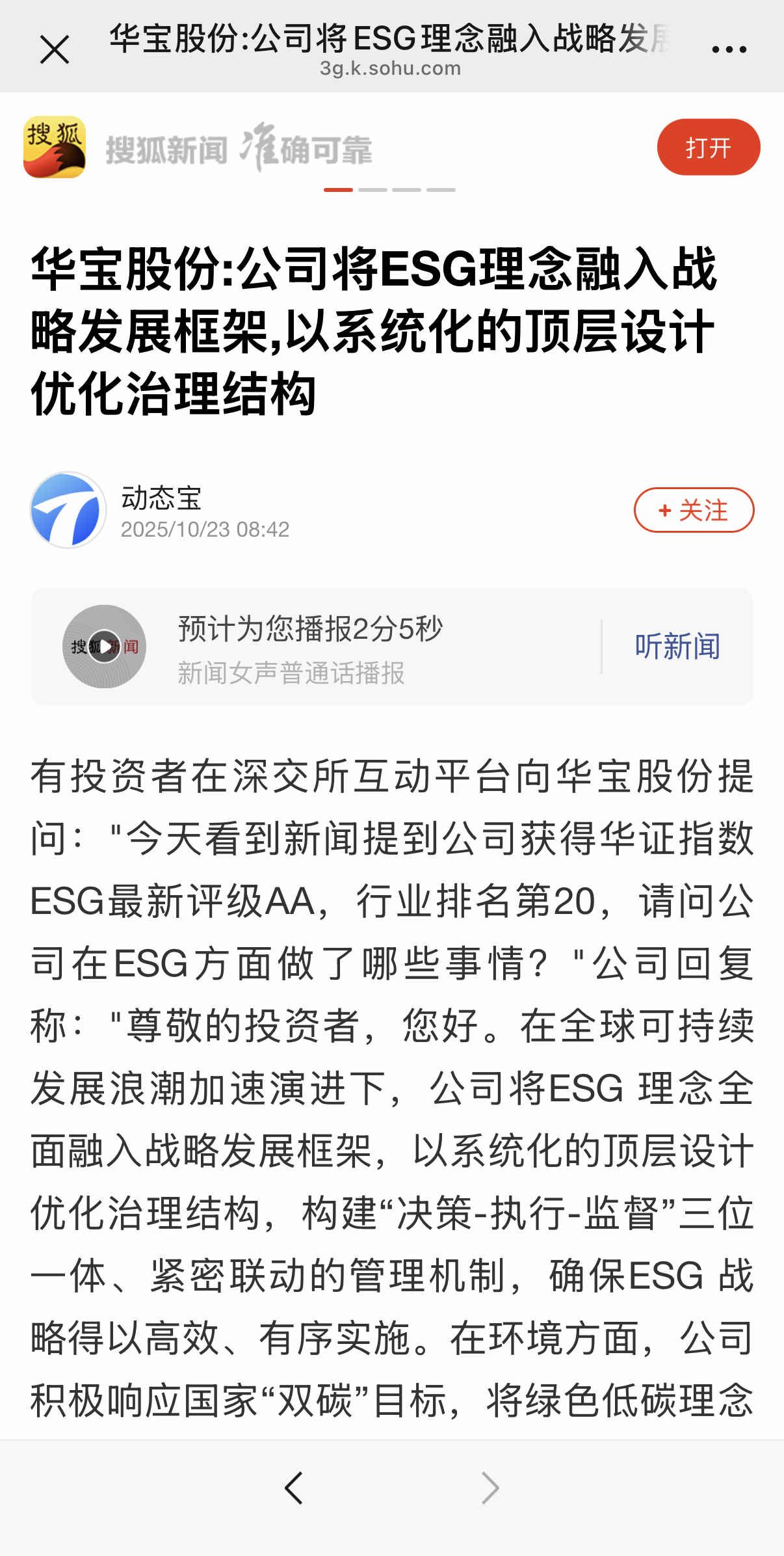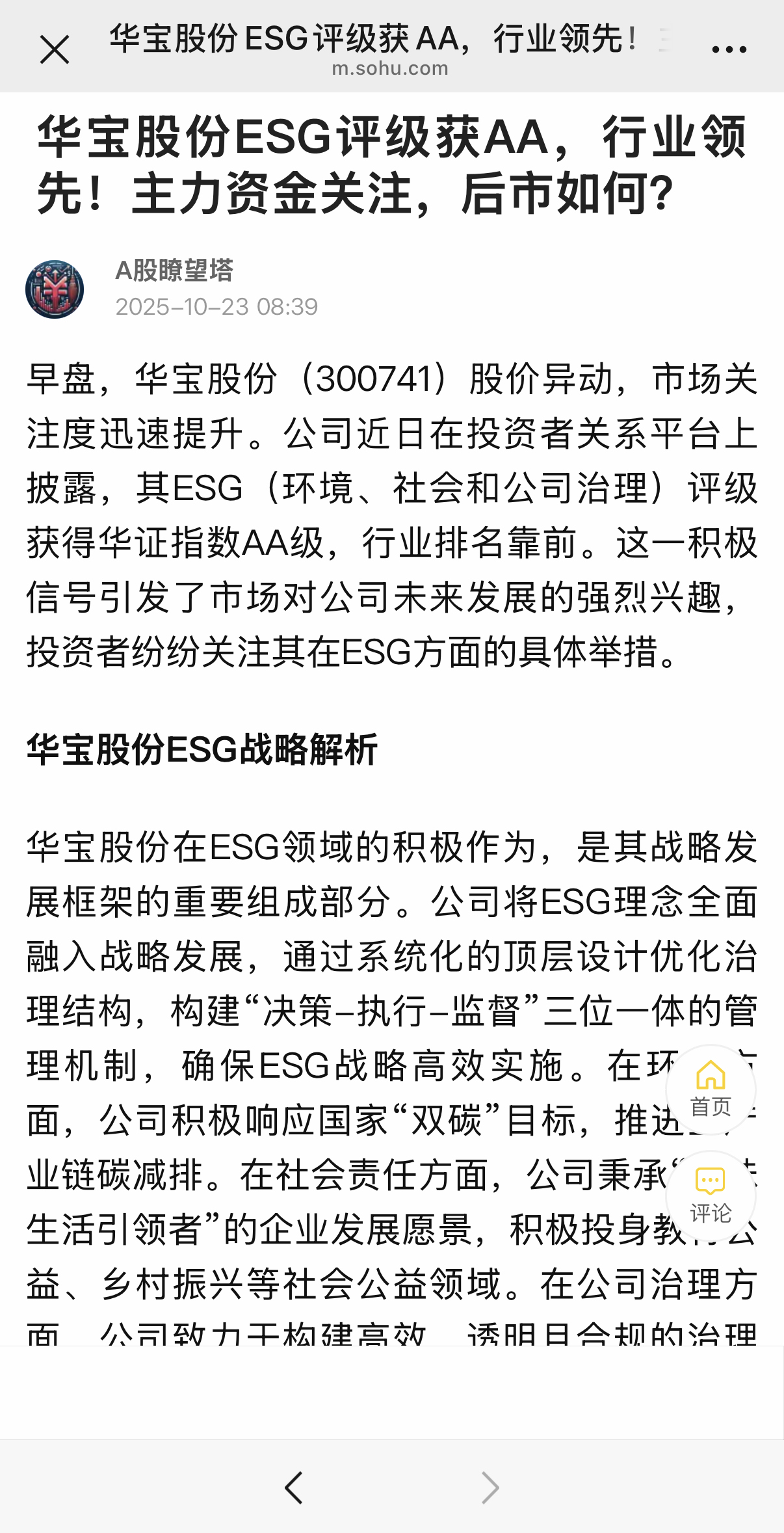 - 《华宝股份ESG评级获AA,行业领先!主力资金关注,后市如何?》(搜狐-A股瞭望塔)