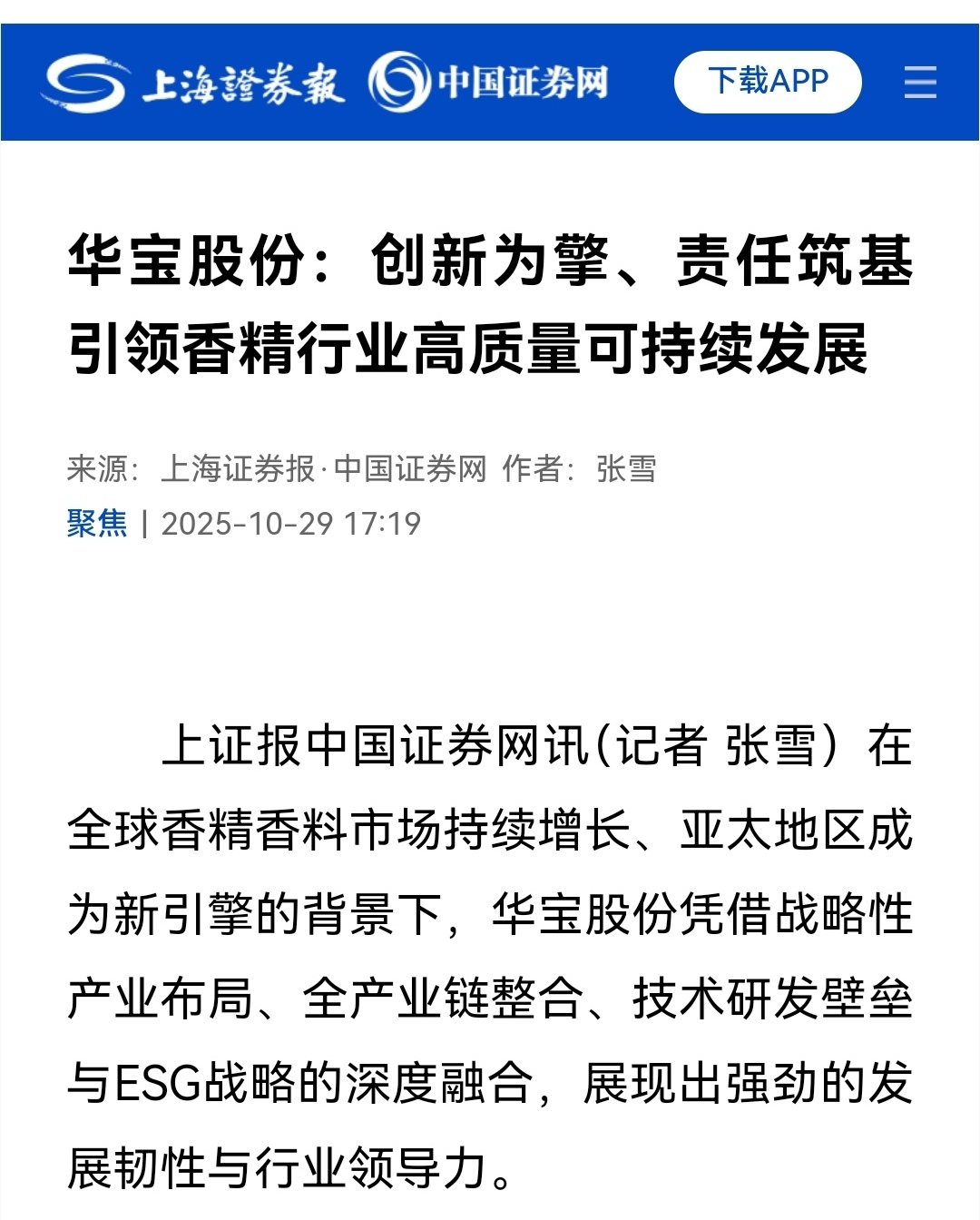 华宝股份表示,未来将继续深化技术创新与ESG实践,巩固行业领先地位,为股东、客户及社会创造可持续价值,以实际行动书写中国香精行业高质量发展的优异答卷。公司此次获得权威媒体关注,进一步印证了公司高质量发展路径的正确性与可持续性。